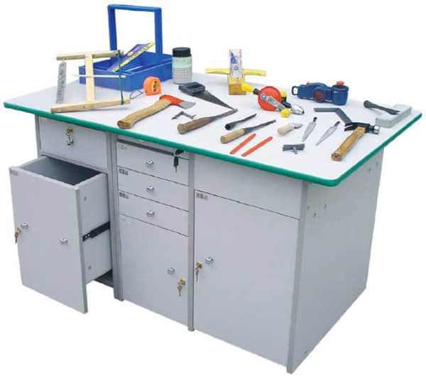 功能:桌面材料选用16mm厚双贴面三聚氰胺板,桌体板截面选用PVC封边经全自动封边机加温180摄氏度胶封。桌面材料选用18mm厚双贴面三聚氰胺板,桌面板截面选用绿色T型PVC封边槽封。桌体设计由二独立单元组合在一起,例如烹饪、缝纫、手工工艺、洗涤为A独立单元,金工、木工为B独立单元。如果A独立单元或B独立单元单独操作时,桌面可翻转自如,而且各独立单元的配备都储放在各自独立单元桌体里面。