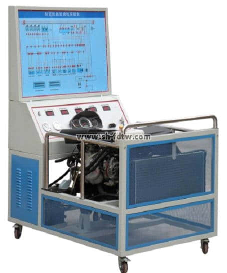 发动机总成和发动机控制单元、仪表总成、冷却液温度传感器、进气温度传感器、节气门控制总成、空气流量计、发动机转速传感器、凸轮轴位置传感器、氧传感器、点火开关、整套散热机构、汽油箱和汽油泵总成、蓄电池、五个数字电压表、真空压力表及燃油压力表、带有完整彩色三维数码激光打印电路原理图面板、外接式检测端子、故障设置盒总成、可移动台架、使用说明书及实验指导书。