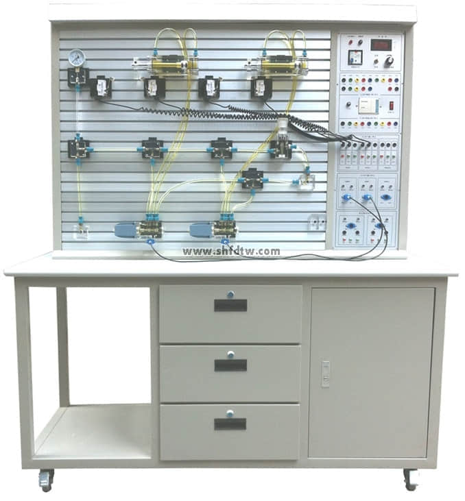 2、实训桌、实训台为铁质双层亚光密纹喷塑结构,实训桌柜内存放气动元件等。