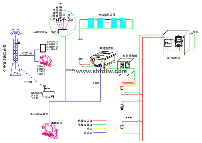 在晴朗的白天,装在屋顶上的光伏组件发出的直流电经过并网逆变器逆变成与电网同频率同相位的单相交流电给负载进行供电,在夜晚或阴雨天等太阳光照不足的情况下,系统处于待机状态,负载用电全部来自电网。另外在系统与互联网联网情况下,可以通过系统监控软件来实时查看系统的运行状态和故障信息,或者是选配远程通讯数据采集器,将系统工作数据通过GPRS或以太网,传输到您的手机、平板电脑或任意一台联网的电脑,以便于远程实时掌控电站的信息。