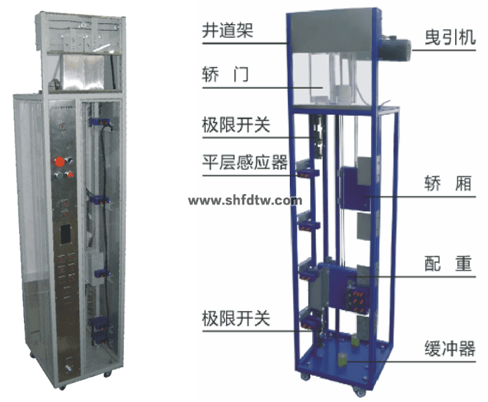 1、模型电梯设4层4站,由模拟井道架、轿厢、对重、曳引机、电梯门、门电机、各层站外呼盒及主要安全装置组成,固定设置在实验台侧面。模拟井道架内需配置用于检测轿厢位置的楼层感应器、平层感应器(与实际电梯相似)等,其接线端子引至模拟井道架的插接孔上。井道架采用金属材料为主体支架,有机玻璃封闭。★设备必须采用台式结构,设置活动式抽屉电气板,每层抽屉板均设置有公共接线板(总线型接线方式,总线连接点数必须达到120点以上),抽屉电气板之间采用工业坦克链连接,公共抽屉板连线采用真实电梯多芯随行电缆。