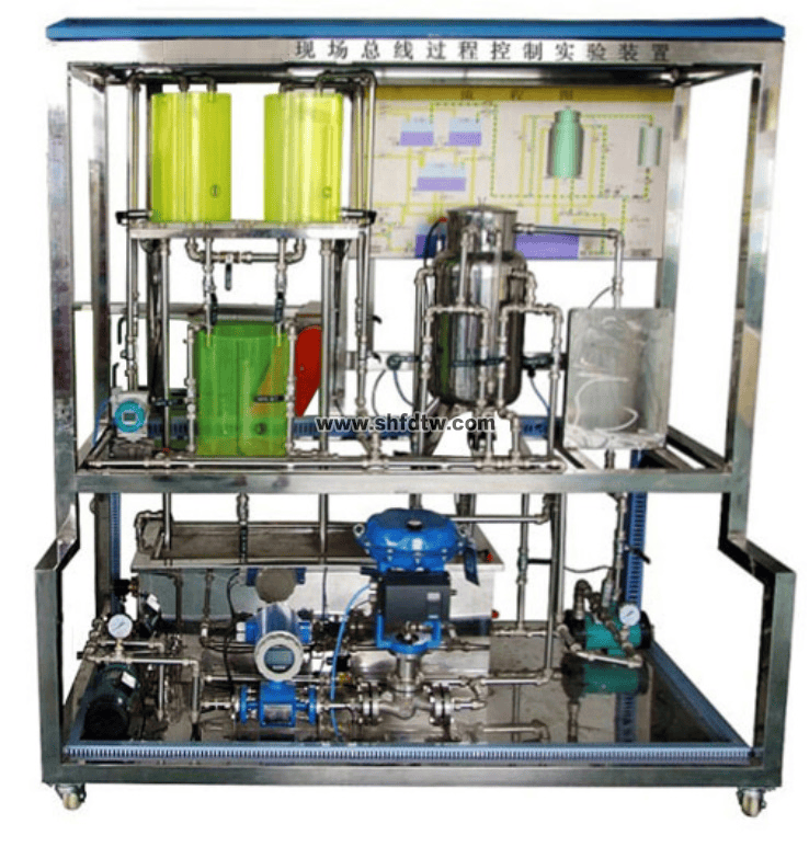 现场总线过程控制实验装置是一套基于PCS现场总线控制的实验设备,它是集自动化仪表技术,计算机技术,通讯技术,自动控制技术为一体的多功能实验装置。系统包括流量、温度、液位等热工参数,可实现系统参数测定、单回路控制、串级控制、前馈控制、比值控制等多种控制形式。控制系统采用西门子的分布式I/O单元ET200M,监控软件采用SIMATICWINCC。采用现场总线的液位变送器、压力变送器、涡轮流量计、变频器、电动调节阀、温度变送器以及分布式I/O模块。该实验装置既可作为本科、专科、高职过程控制课程的实验装置,也可作为研究生及科研人员在复杂控制系统、先进控制系统研究方面提供物理模拟对象和实现手段。同时也可以作为学习现场总线过程控制的一个实验手段。