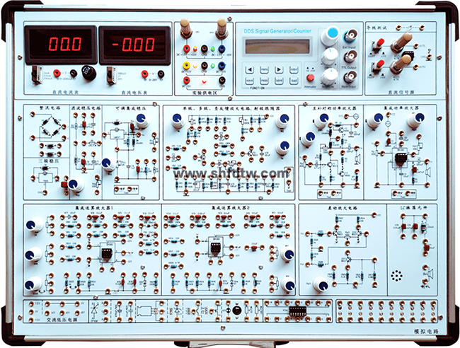 模拟电路实验箱由铝木合金箱体、高性能线性电源、和实验电路板组成。其中实验电路采用固定功能模块方式,电路原理和元器件符号清晰,实验用元器件可以焊装在线路板的反面,安全可靠,不易损坏,也可以装在线路板的正面,元件直观可见,感性认识强,正面还有实验电路原理图,使学生在实验时对原理一目了然。