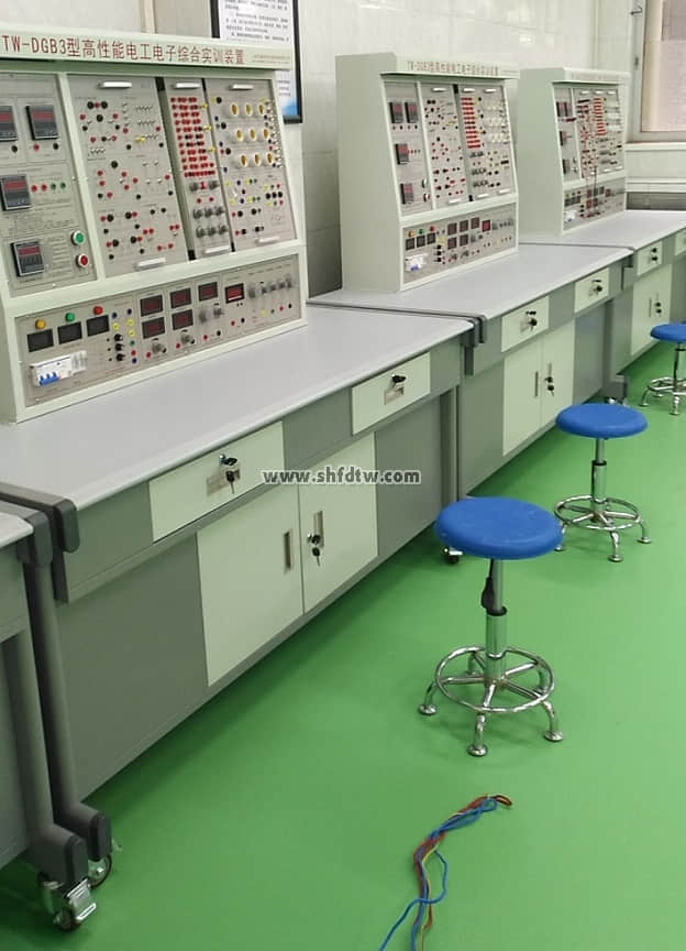 1、实验桌:全钢结构,钢质喷塑,耐磨防火面板,设有抽屉、柜子用于存放工具、配件等。