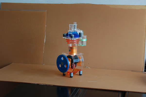 本品选用透明有机玻璃制作,内中部件均以硬质塑料料加工,用 螺丝固定在金属高温烘漆而成的车架上。各总成部分都以压模成形加工,代替过去胶粘合的方法,使产品在强度上有很大提高。发动机总成用电机驱动,在油门处设有调速装置,能演示发动机转速高低。离合器分离明显,操纵灵活,离合器外壳整体压模而成,变速箱和各档齿轮用各种颜色表示,换档灵活,手制动美观。后桥外形压模而成,内中主减速、差速转动自如,轮毂刹蹄压模成型,刹蹄可调节,前桥轮鼓可调整,转向装置以及电瓶、油箱、水箱,制动管路分布清楚一目了然。电路采用对插件前后分布,灯架、风窗、仪表板、后灯架用透明有机玻璃压模成整体美观逼真。
