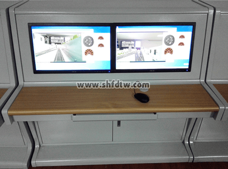 调度员培训工作站HMI可以让学员实际操作ATS人机界面,实现站场和列车数据的显示,完成人工进路设置、部分或全部信号机自排全开/自排全关、追踪全开/追踪全关、单独操作或锁闭轨旁信号设备、车次号操作、控制权的交接、设置紧急停车、扣车、跳停指令、联锁相关的道岔单操、道岔单锁、关闭信号、重新开放信号、封锁(单个或全区)信号、区段封锁等功能。学员也可分析和处理工作站上出现的相关事件信息和故障报警信息。调度员工作站台面及HMI的界面如下图所示。