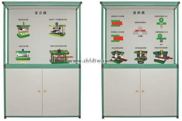冲压模具设计与制造陈列柜共分八个柜和一个电脑控制台,进行多媒体动画同步演示。由PC电脑软件控制顺序或任选播放三维动画同步模型演示冲压模具功能原理。本套陈列柜47件冲压模具均采用高强度硬聚氯材料制作而成,各种模具均可进行拆分装配。