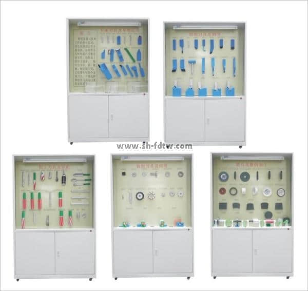 第一柜:车床刀具及车削运动 | 90°车刀、45°车刀、切断刀、成形刀、车螺纹刀、车孔刀、硬质合金可转位车刀、带卷屑槽的梯形螺纹精车刀、高速钢切刀、单轮滚花刀、双轮滚花刀、带有加强肋的端面车刀、端面沟槽车刀、典型车孔刀、普通成形刀、棱形成形刀、圆形成形刀、弹性刀杆螺纹车刀、主剖面系及其角度、法剖面系及其角度、进给、切深剖面系及其角度 |