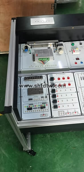 单片机控制功能实训考核装置采用铝木台式结构。实训台的抽屉柜用于存放实训模块,抽屉柜与台面之间布置实训模块安装支架,最上一层是工作台台面。用于技能竞赛时在台面上放置设备安装底板,在底板上安装试题拟定的单片机控制装置需要的模块,连接控制电路,编写的控制程序输入单片机后,按下运行指令开关,单片机控制装置就按程序运行。放置在单片机实训室中,这就是一张实训台。当讲解理论或实训项目中的相关知识时,可以当做课桌;当需要进行实际操作时,将台面打开,就露出放置在安装支架上的模块,在需要的实训模块间按实训要求连接电路,编写控制程序,就可以按照设计的实训项目进行单片机技术的教学。