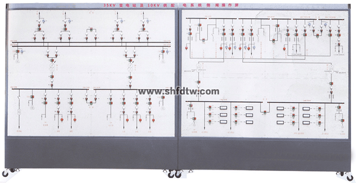 “35kV变电站及10kV供配电系统倒闸操作屏”是针对变电站倒闸操作而专门研制的实训装置。本系统含35kV、10kV和0.4kV三个电压等级:35kV具有4路进线,双母带联络;10kV侧采用单母分段,两入两出,环网供电;0.4kV侧采用单母分段,并具有备用发电系统。在此典型35kV变电站模型上,学生可以进行各种工况下的倒闸操作。变电站的电压等级和结线方式也可以根据用户要求设计。因此本装置适合各类职业院校供配电类、电力公司、职业技能培训部门等机构的培训、考核。