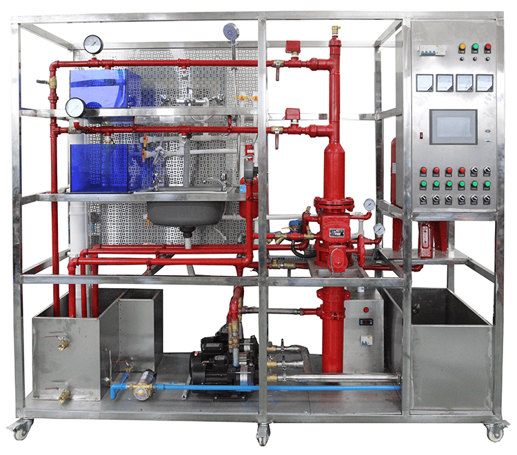 2、消防给水系统:主要有给水箱、喷淋泵、稳压罐、湿式报警阀、压力开关、水流指示器、消防给水管道、闭式喷淋头等组成。管路采用镀锌管进行设计,可进行镀锌管的切割、套丝、安装和通水试验操作,通过控制系统可实现喷淋灭火功能。