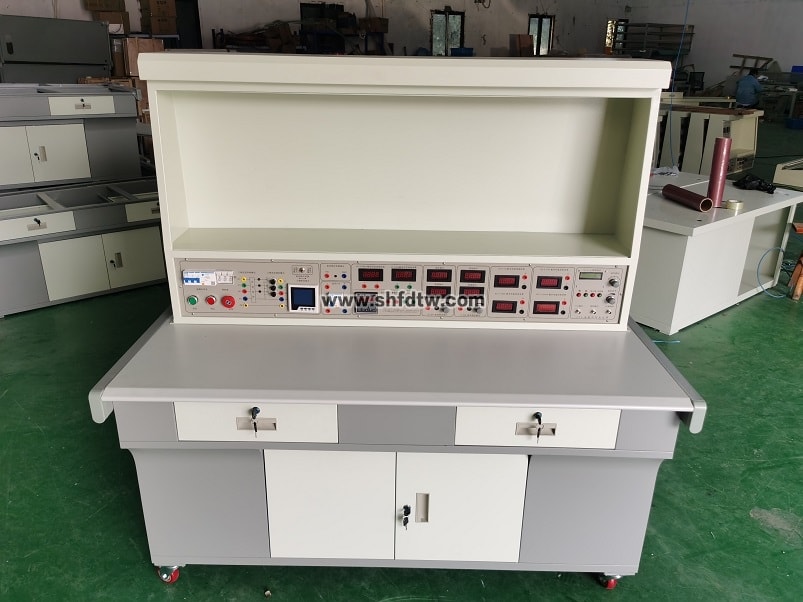 1、实验桌:全钢结构,钢质喷塑,耐磨防火面板,设有抽屉、柜子用于存放工具、配件等。