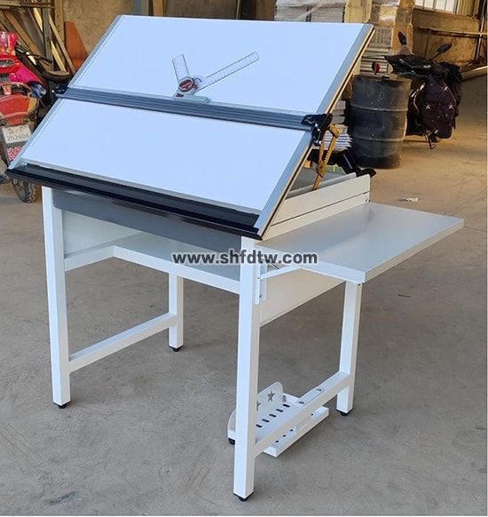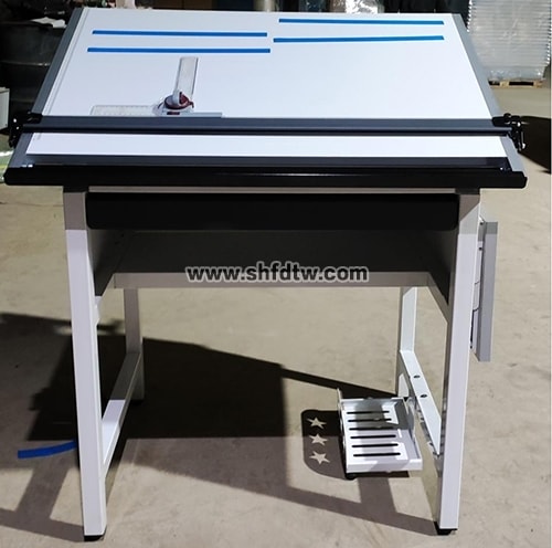 (2)绘图板基板材质为E0级国际通用刨花板,正面敷以白色磁性PVC塑胶板面,背面以太白色0.35mm通用PVC器膜,四周采用1mm白色塑料条封边,检图板正面配以不锈钢压纸条,在板面上可绘制不同规格的图纸。