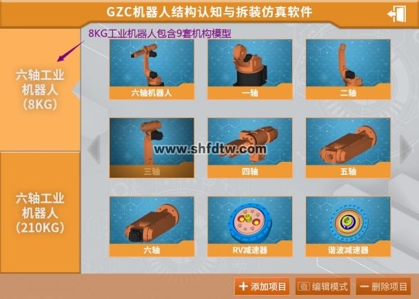 3.2种型号17套六轴机器人机构模型:系统内置2种型号17套六轴机器人机构模型。其中型号为8KG的工业机器人包含六轴机器人整体1套、一轴机构1套、二轴机构1套、三轴机构1套、四轴机构1套、五轴机构1套、六轴机构1套、RV减速器机构1套、谐波减速器机构1套;型号为210KG的工业机器人包含六轴机器人整体1套、一轴机构1套、二轴机构1套、三轴机构1套、四轴机构1套、五轴机构1套、六轴机构1套、RV减速器机构1套。提供符合上述功能的软件截图。