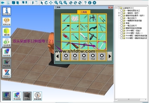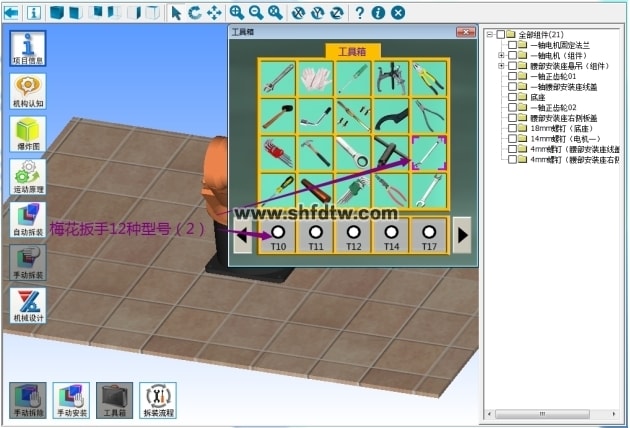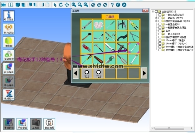 9.手动拆装:系统提供手动拆装功能,手动拆装过程可进行自动判断拆装顺序及拆装工具选择的正确性,并且在手动拆装模式下,场景中会相应增加工具箱。