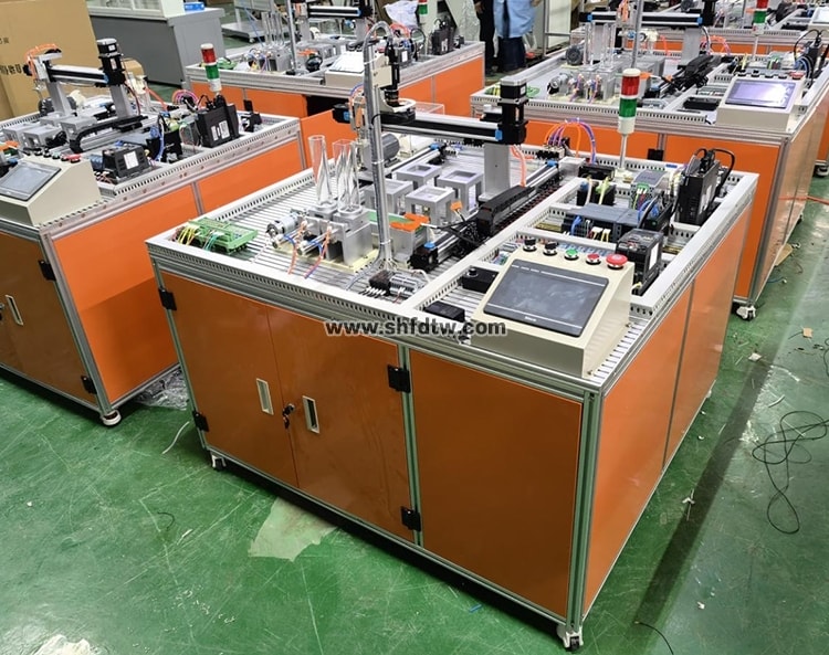 2、以上模块对应以下单元:PLC单元、485通信单元、工业视觉识别单元、RFID产品溯源单元、气动控制基本单元、变频调速单元、触摸屏单元、以太网交换机、伺服系统控制单元等组成、温度检测变送单元。